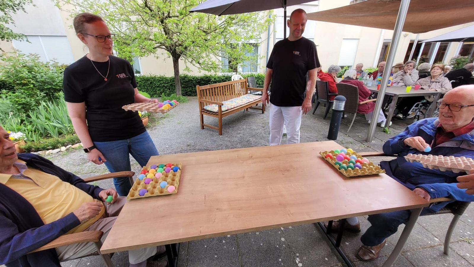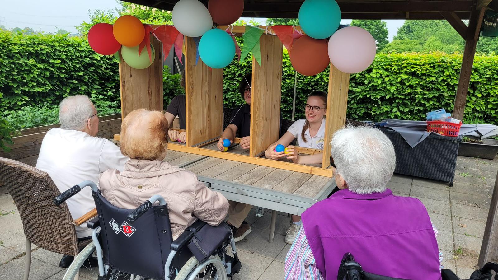 Bei bestem Wetter verlegten wir die Feierlichkeiten in den Garten der Einrichtung. Dort warteten abwechslungsreiche Spiele auf die Gäste: Beim Entenangeln kam es auf Geschicklichkeit an, während der Lebendige Spielautomat für viele Lacher sorgte. Besonders beliebt war auch „Hau den Leo“, bei dem mit Poolnudeln auf spaßige Weise die Reaktionsgeschwindigkeit getestet wurde. Ein weiteres Highlight war das Pingpong in Eierkartons, bei dem es jede Menge Jubel und Anfeuerungsrufe gab. Als kleine Motivation gab es bei den Spielen auch Eierlikör als Gewinn, was bei den Bewohnerinnen und Bewohnern für besonders gute Stimmung sorgte.